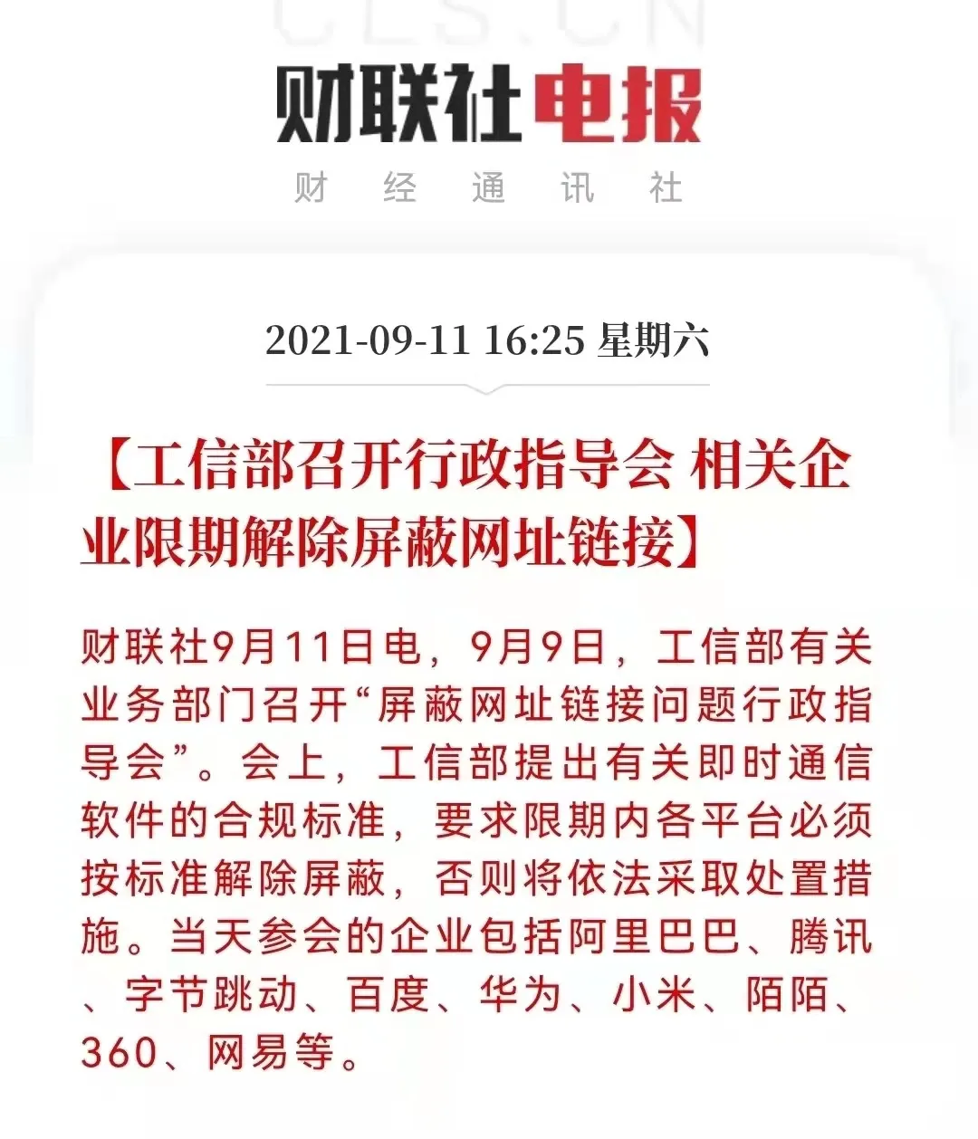 工信部有關業務部門召開了“屏蔽網址鏈接問題行政指導會”。