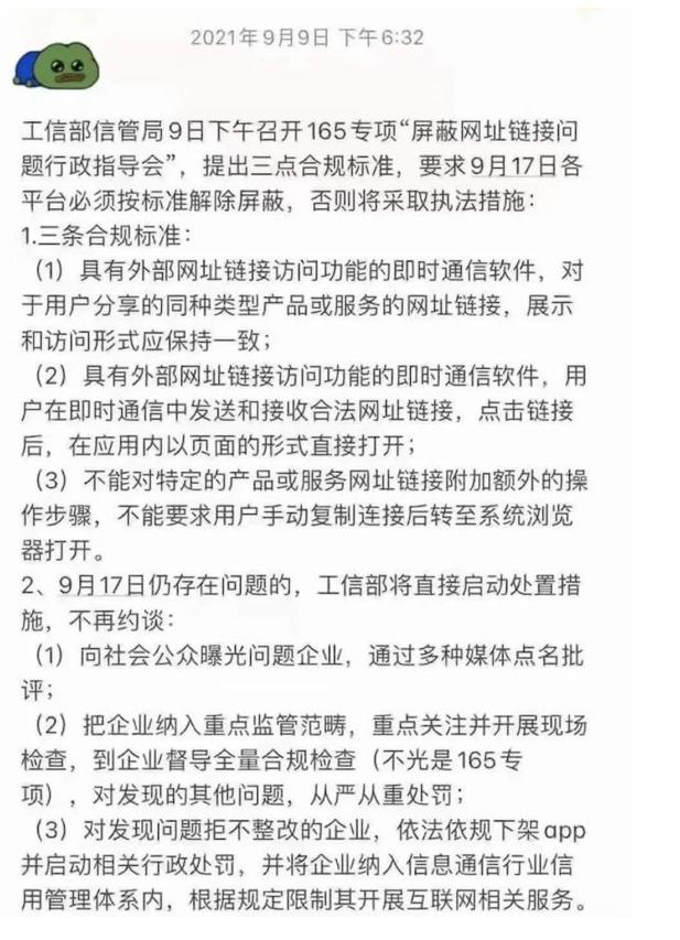 工信部提出有關即時通信軟件的3點合規標準,要求各平台在9月17日前必須按標準解除屏蔽,否則將不再約談,而直接採取下架等執法措施。