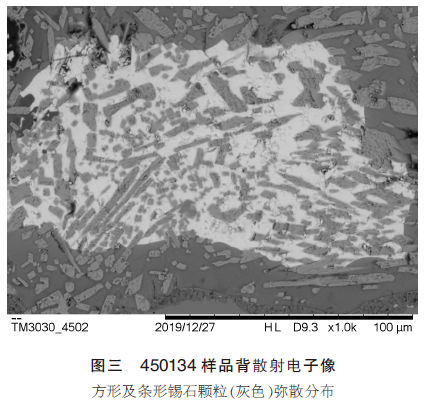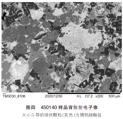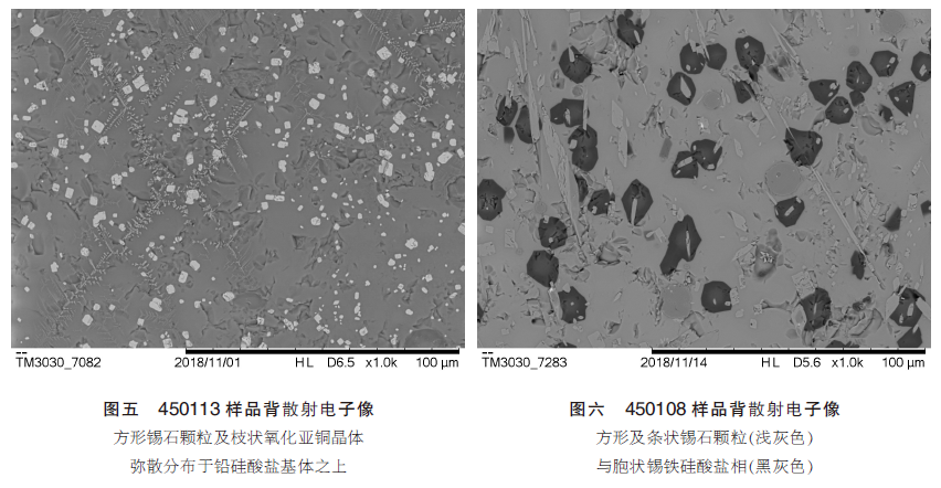1.含錫物相:包括自形為方形或條狀的錫石顆粒(圖三);含錫鈣(鐵)硅酸鹽,多呈胞狀(圖四);2.含鉛物相:包括鉛硅酸鹽,常為多氣孔的均一玻璃態,表面可見貝殼狀斷口(圖五);3.含銅物相:包括銅氧化物,多呈方形,在富氧環境中常偏析枝晶(圖五)。
