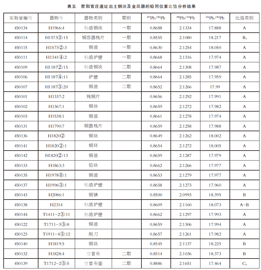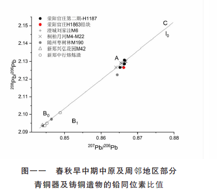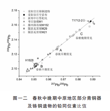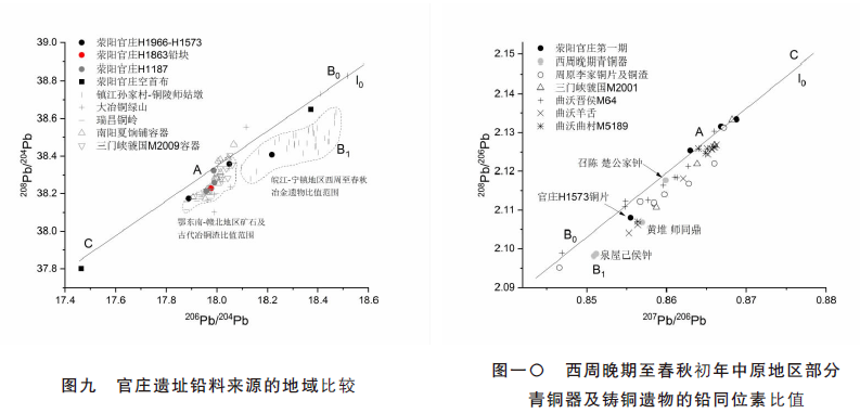 官莊遺址青銅器及鑄銅遺物的鉛同位素比值具有較高共性,並且較為完整地展現了兩週之際至春秋中期主要鉛料隨時代的變化。為便於討論,以208Pb/206Pb對207Pb/206Pb作圖,以經驗參考線l0:y=1.6162x+0.7288劃分區域,則在l0中段、208Pb/206Pb在2.12~2.14間的比值記作A類,208Pb/206Pb在2.09~2.12間的比值記作B類,208Pb/206Pb在2.15~2.18間的比值記作C類。B類比值中,沿參考線l0左端分佈的記作B0類,在l0下方的則記作B1類。在西周晚期,中原地區青銅器的材質以錫青銅及低鉛的鉛錫青銅為主,鉛同位素比值的分佈相對分散,包含A、B0、B1三類。進入春秋早期,中原地區青銅器鉛含量升高,鉛同位素比值趨於集中,A類比值成為主流,個別地區存在一定比例的B1類比值;春秋中期起,B0類比例迅速增高,取代A類成為主要鉛料類別。