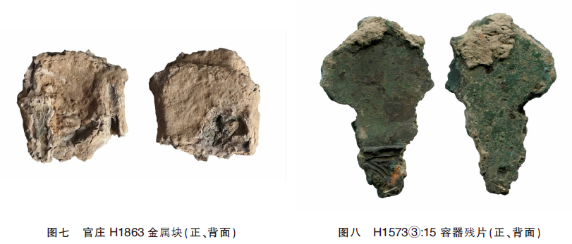 官莊遺址出土一些碎銅片,大小各異,厚薄不均,並多與熔鍊渣、爐壁塊共出,可能為待重熔的金屬原料。H1573③:15銅片壁厚達0.5釐米,弧度極小,局部殘存鑄造紋飾(圖八),可能為大型禮容器的殘片。此殘片及同出的銅渣塊,成分相近(表三450114-1行及表四450114-2行),並且均具有富鐵的材質特徵,不排除銅渣塊與銅殘片對應同一件器物的可能性。