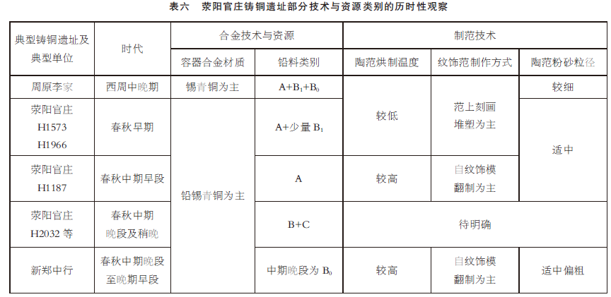 由官莊遺址的科技分析研究可以發現,鑄銅遺址的技術及資源的演變並不一定同步,並對青銅器裝飾風格的變化有不同程度的影響(表六)。陶範是紋飾的實物載體,故而青銅器紋飾風格的演變與制範技術關係相對密切。合金配比能夠決定銅液的流動性,低錫的合金配比往往限制了紋飾的精緻程度,故而器物的裝飾風格與合金材質也存在一定關聯。但合金技術則在考慮技術因素外,更多地被金屬資源的豐歉所左右,而金屬尤其是貴重的錫料又受到貿易通路及政治格局的強烈影響。春秋初年中原地區青銅器錫含量的降低,很可能即與兩週之際政治環境劇烈變動有關;春秋中期青銅器自南向北錫含量的重新升高、B類比值對應鉛錫資源的廣泛應用,也與楚國北進的史實基本相合。故而春秋時期鑄銅作坊的金屬資源與合金技術與列國間的政治、經濟互動息息相關,在針對一國一地展開研究時,也需對時代共性有所把握。