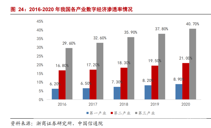 其中,第三產業的數字化程度最高,2020年達到了 40.7%,同比提升了1.9個百分點,進程進入了成熟穩定期。