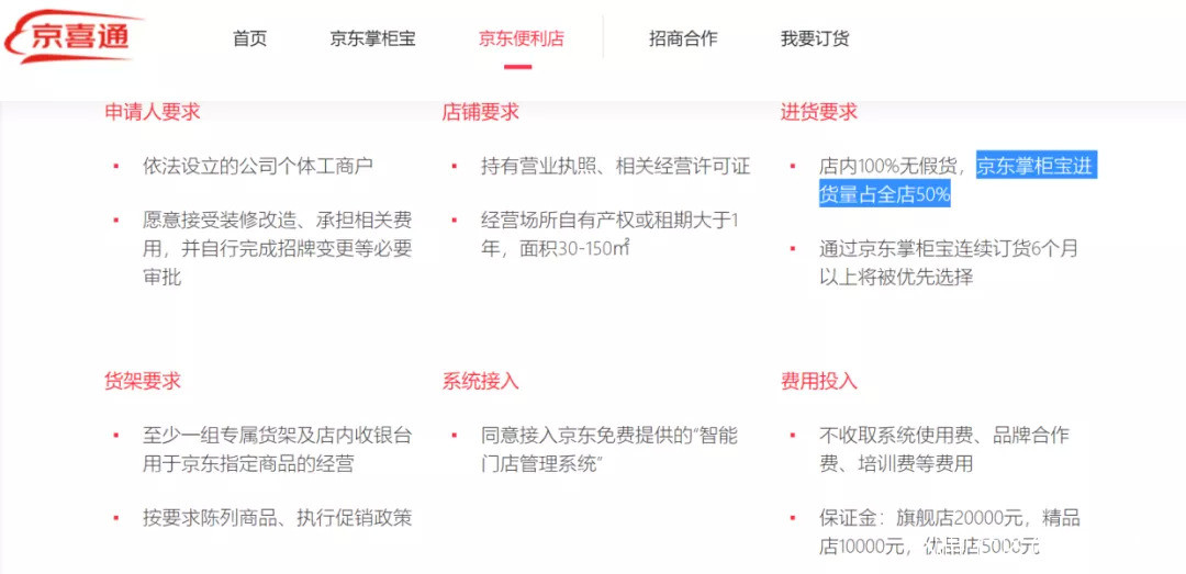 但是,在京東便利店的加盟官網“京喜通”上,加盟條件有:經營場所自有產權或租期大於1年,面積30-150㎡;保證金:旗艦店20000元,精品店10000元,優品店5000元;通過京東掌櫃寶連續訂貨6個月以上將被優先選擇,京東掌櫃寶進貨量佔全店50%。