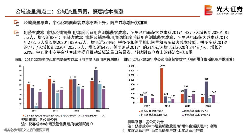 據光大證券發佈的《私域流量行業深度系列報告》顯示,阿里係獲客成本從2018年278元/人增長到2020年929元/人,達到近234%增長,獲客成本最低的拼多多也從2018年的77元/人增長到2020年203元/人。