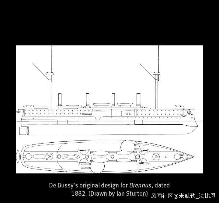 這是十年裏大半時光英國和意大利這兩個主要海軍過絕大多數主力艦產量,時間從1873年直到1881年;**其中大多數噸位大於定遠級而且一部分噸位幾乎達到其兩倍。**我進一步建議去搜索一下德克薩斯——美國第一艘遠洋戰列艦;和布倫努斯——法國新學派時期前最後一艘計劃的遠洋戰列艦,的早期設計案。美國和法國同時計劃把他們寶貴的主力艦建造成交錯佈置耳炮台的炮位模式。俄國在1870年後沒有更多主力艦下水,但是1883年訂購了3+1=4艘類似但是不完全一致的鐵甲艦用於黑海。