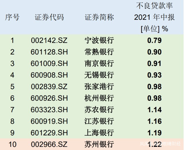資產質量方面,截至2021年6月末,蘇州銀行不良貸款餘額25.12億元,較年初下降0.80億元,不良貸款率1.22%,較年初下降0.16個百分點。但是與同行業相比並不好看,《眼鏡財經》注意到,在江浙滬的區域性銀行中,蘇州銀行的不良率處於末位水平。