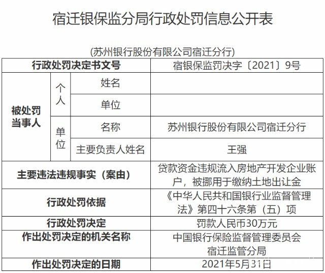 6月8日,銀保監會宿遷銀保監分局公佈了一張罰單,蘇州銀行宿遷分行因貸款資金違規流入房地產開發企業賬户,被挪用於繳納土地出讓金,被罰款30萬元。