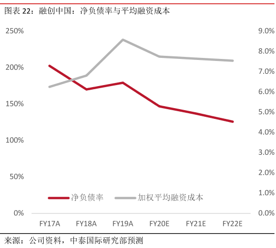 公開數據顯示,在舉債抄底的高峯期,融創的淨負債率一度逼近200%,突破了政策規定的紅線。同時,在金融去槓桿的環境中,融創的平均融資成本始終維持在高位。