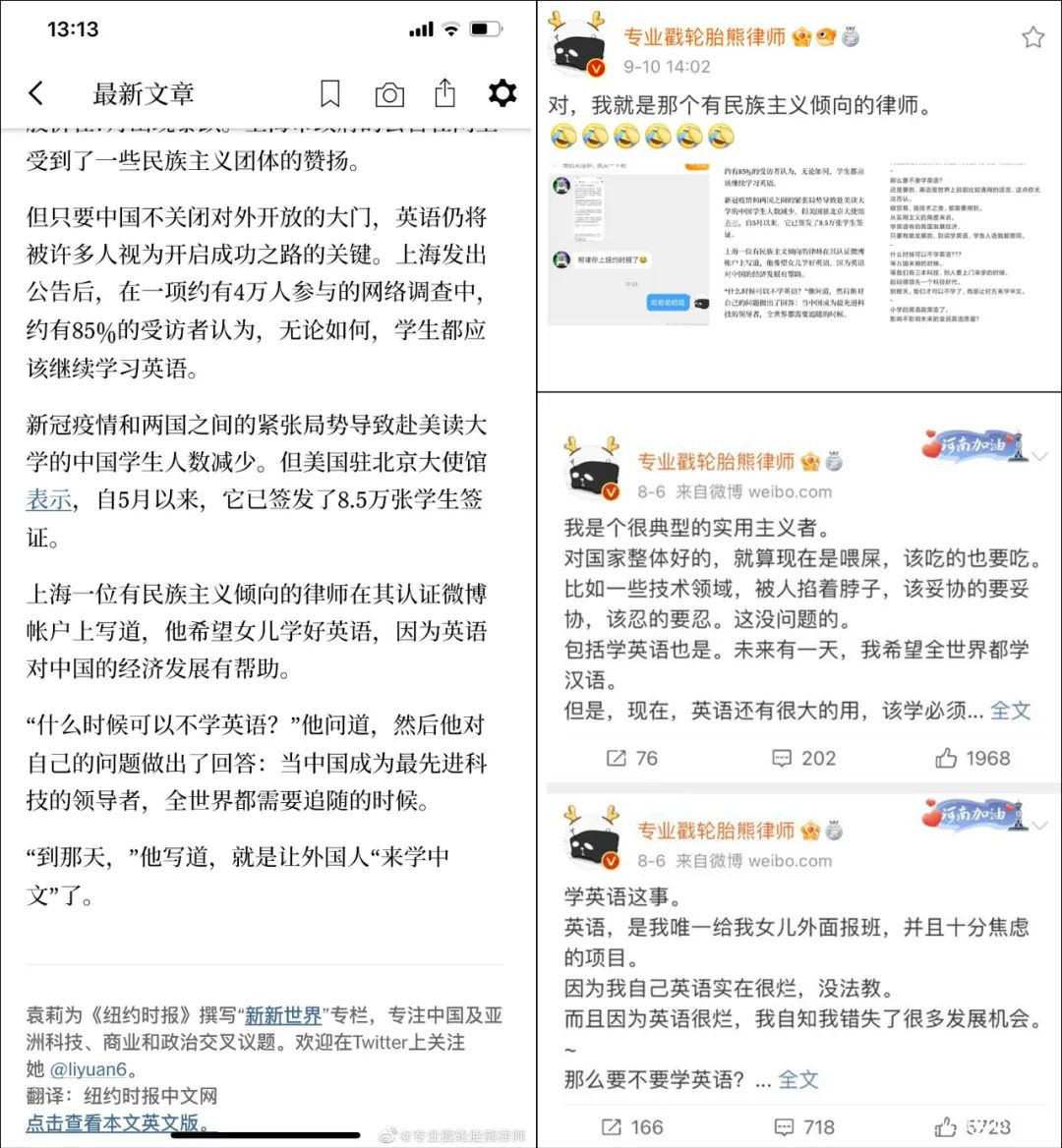 結果這段充滿中年人憂思的話語被紐約時報的記者掛了——上海一位有民族主義傾向的律師在其認證微博賬户上寫道,巴拉巴拉。