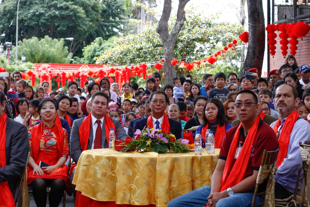 2018年委內瑞拉第二屆新春廟會成功舉辦,李寶榮大使和現場觀眾一起觀看錶演(圖源:中國駐委內瑞拉大使館文化處)