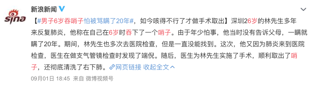 最近看了一則新聞,男子6歲吞哨子怕被罵瞞了20年**,**哭笑不得。