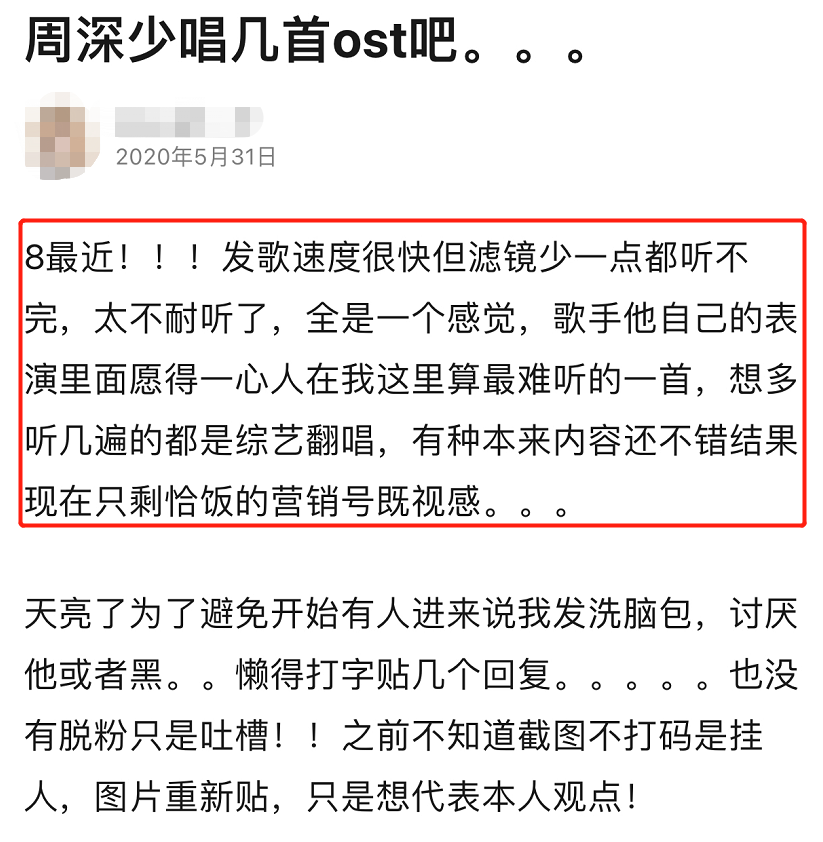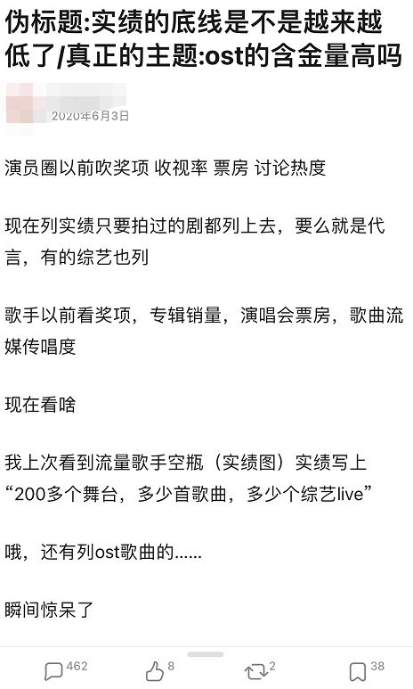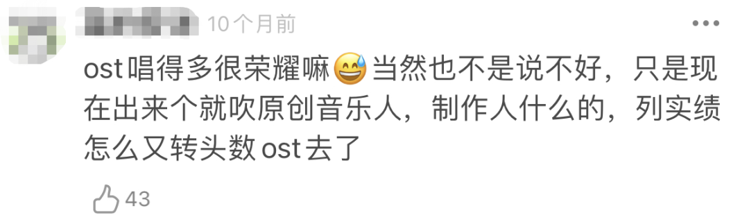 優質ost與劇集互相成就,熱度閉環反哺,ost連接着劇集與歌手。相較於劇集方對於ost的重視,歌手方面對於ost則有不一樣的看法。其實,在成名歌手圈,粉絲有專屬鄙視鏈,歌迷們常常有關於ost含金量的討論,甚至掀起罵戰。在歌手“實績”比拼當中,似乎有個不成文的規定,認為ost歌手並非榮譽稱號,而是失去音樂獨立性、向市場妥協的“恥辱”表現。
