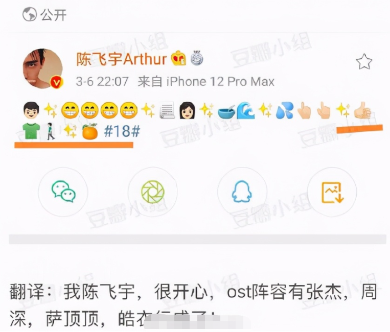 此前,陳飛宇在發佈了一條emoji加密微博,網友解密其內容為:“很開心,ost陣容有張傑,周深,薩頂頂,成了!”