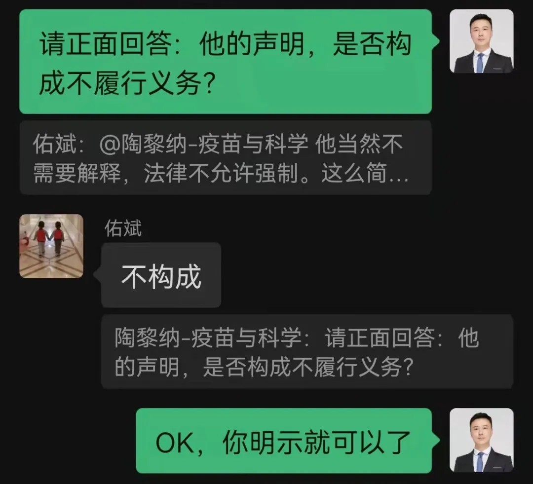 不過,陶醫生在一個微信羣裏討論劉律師的態度問題時,有一個叫佑斌的大律師,跳出反對。他反覆強調國家衞健委微博裏的“嚴謹審慎,認真評估,確保依法依規,嚴守安全底線”,就是反覆看不見“公民有義務接種”。