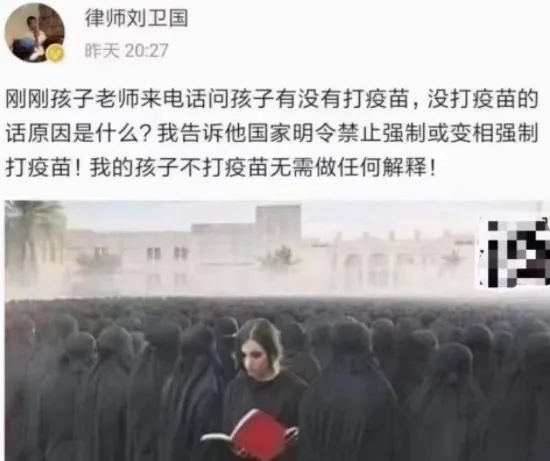 那麼,接種COVID-19疫苗既然已經是義務了,再提自願接種原則就不合適了。否則,沒有禁忌症而自願不接種,算不算不履行義務呢?比如下面這位劉建國律師大言不慚地稱:我的孩子不打疫苗無需做任何解釋!