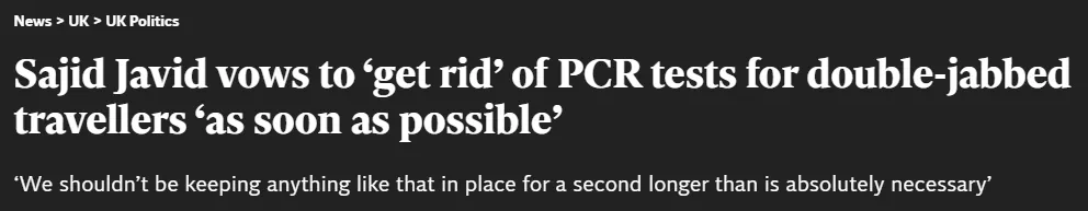 “我們有大量的防禦措施;當然,我們仍然希望保持非常謹慎,”賈維德告訴天空新聞,“但是從某些國家/地區返回英國時需要進行的PCR 測試……我想盡快嘗試擺脱這種情況。”