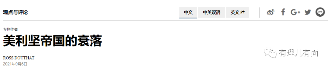 9月6日,紐約時報刊登一篇《美利堅帝國的衰落》的文章,文章黯然寫到,美國的失敗“始於1960年代的東南亞,然後是9·11之後的中東和中亞”,中俄力量的壯大,“切實地削弱了美國的世界帝國,並熄滅了我們在9·11後真正統治全球的幻想”,並告誡美國人,“要從帝國變回一個普通國家,很難不經歷一次痛苦的墜落”。
