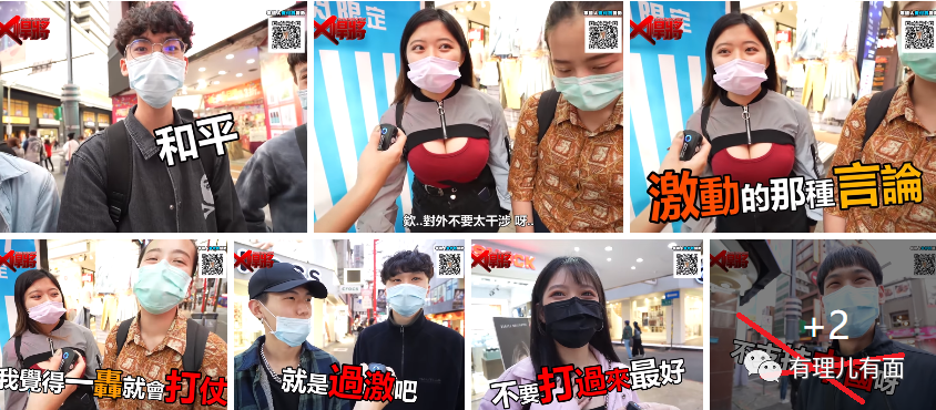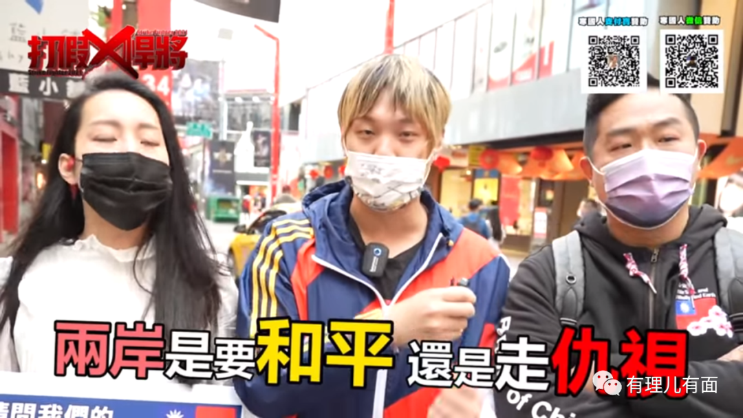 視頻中,“寒國人”隨機在台北西門町街頭採訪了17位台灣年輕人,詢問他們覺得“兩岸應該繼續仇視對抗還是和平”,結果僅一位表示要繼續仇視對抗,其他都選擇“和平”。