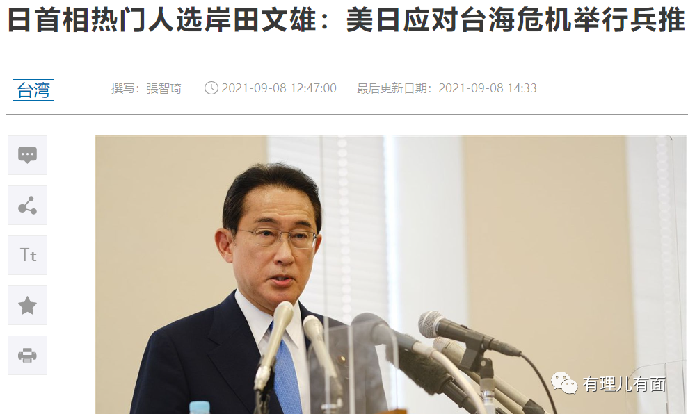 同一天,日本新任首相熱門人選、前日本外務大臣岸田文雄接受《華爾街日報》專訪時説,“日本和美國需要為台海可能爆發危機展開聯合兵棋推演”。