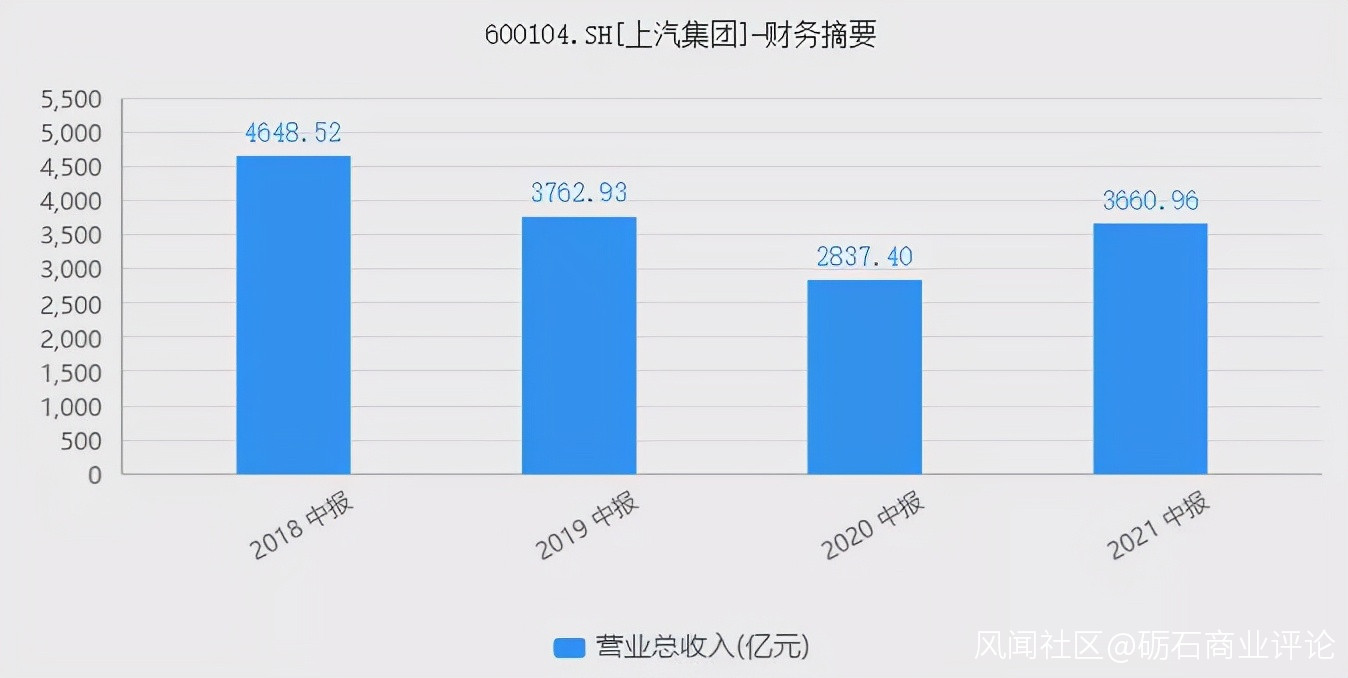 然而,上半年上汽集團經營業績較高的同比增速,更多是源於去年新冠疫情所帶來的低基數效應。通過下圖可以看出,上汽集團2021年營收規模仍低於2019年同期收入水平,較2018年同期更是減少近千億元。