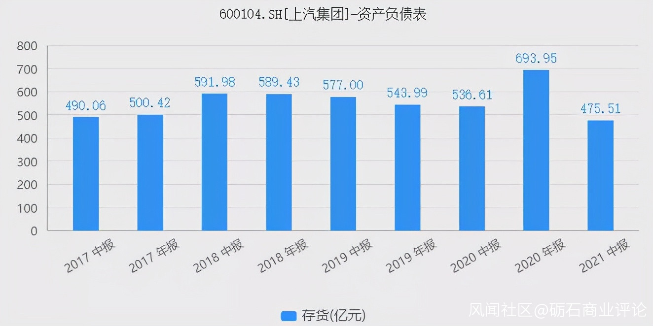 此外,芯片供應對上汽集團仍然是一個較大的挑戰。相比零售量29.7%的同比增幅,上汽集團上半年整車批售同比增速僅有12.1%,公司共完成整車批售229.7萬輛,較零售量少了近65萬元。受此影響,上汽集團存貨金額降至475.51億元,創下自2017年以來新低。