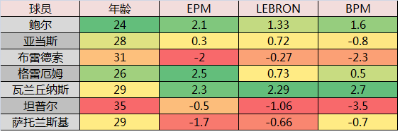 下表是鵜鶘三大運作中涉及到球員的年齡和比賽影響力,可以看到,除了瓦蘭丘納斯確實夠屌之外,鵜鶘到目前為止的運作,似乎既沒有讓他們變得更強,也沒有讓他們變得更年輕。