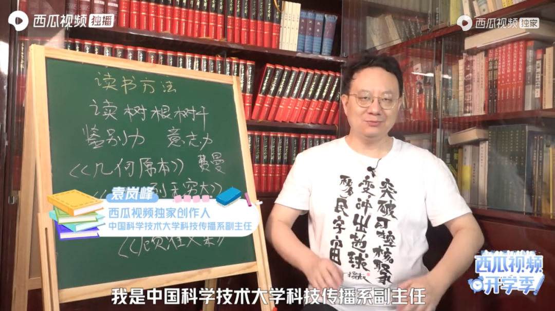 大家好,我是科技袁人袁嵐峯,我是中國科學技術大學科技傳播系副主任、中國科學院科學傳播研究中心副主任。歡迎來到西瓜視頻開學第一課,今天我來給全國的同學們講一節讀書方法課。