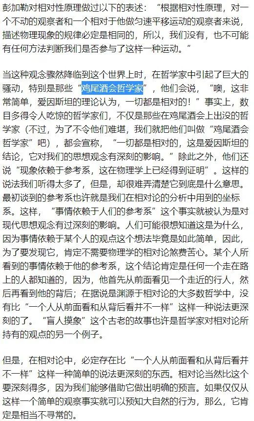 我還非常喜歡此書中的一節“相對論與哲學家”,費曼對各種不懂裝懂亂談相對論的哲學家進行了辛辣的諷刺。費曼甚至給他們起了個外號“雞尾酒會哲學家”,以此表示那些在雞尾酒會上見到的所謂哲學家。他們對什麼都敢談,但實際上談的全都不超過常識的範圍,所以他們對相對論談的全都是錯的,因為他們對相對論説的究竟是什麼連門都沒摸着。如果你深刻領會了這一節,以後你見到各種瞎扯相對論的和瞎扯哲學的就都知道他們錯在哪裏了。