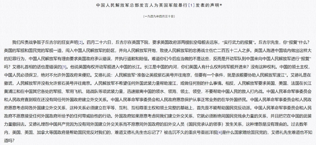 《中國人民解放軍總部發言人為英國軍艦暴行發表的聲明》(https://www.marxists.org/chinese/maozedong/marxist.org-chinese-mao-19490330.htm)