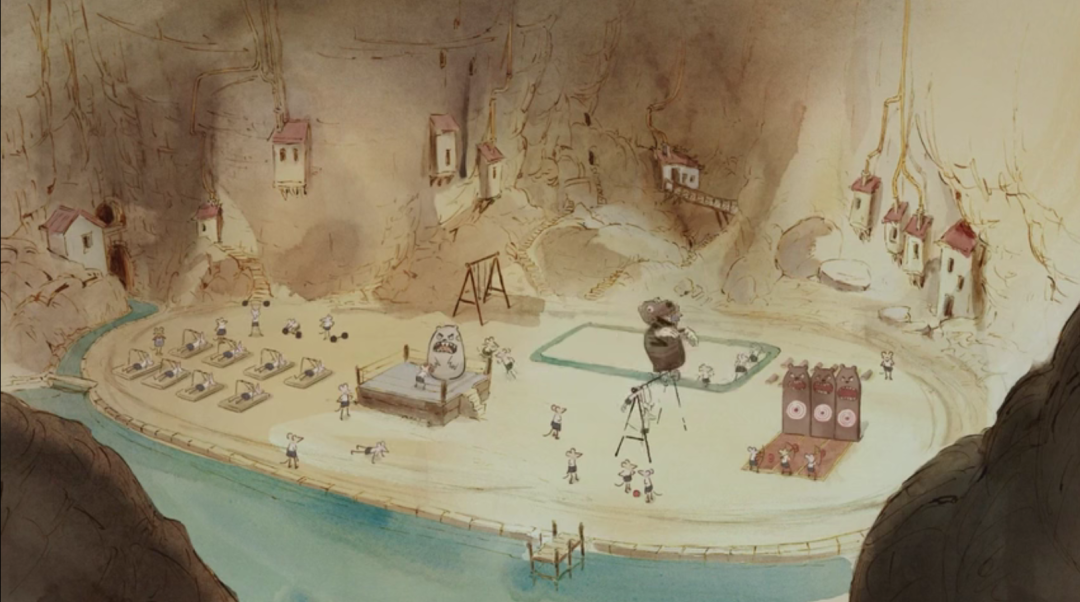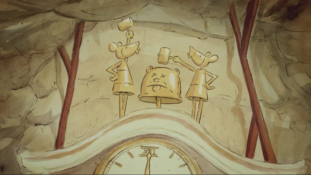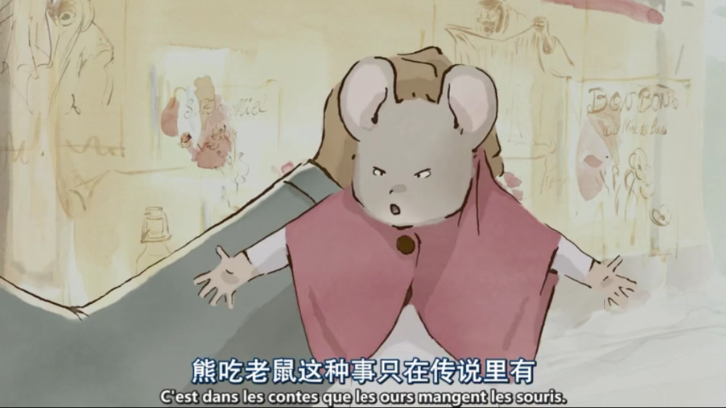 雖然這些畫面往往只是一閃而過,但是它們卻極大地豐富了整部影片的可解讀性。比如當我們跟隨賽娜第一次來到老鼠城市時,可以看到老鼠們正在用老鼠夾鍛鍊身體、鐘的造型是老鼠們正在“欺負”大笨熊、以及街道旁巨大的奶酪廣告,等等。