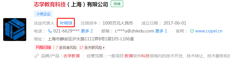 志學教育科技(上海)有限公司註冊資本1000萬元,實繳資本432萬元,法定代表人及實際控制人為葉明球,持股比例達55%。