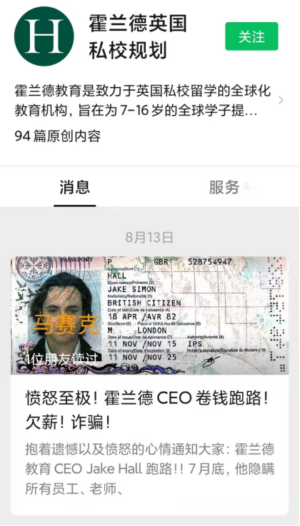 還有做英國留學服務的霍蘭德教育,“雙減”政策剛公佈,其英國老闆就直接捲款潛逃回英格蘭,留下一幫中國員工叫天天不應,叫地地不靈,氣得把老闆護照發到了自家公眾號上。