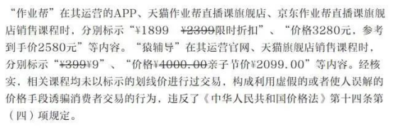 比如今年4月,北京學而思天貓商城官方旗艦店銷售的多款培訓課程存在虛假促銷價格,諸如“價格799,促銷價20”的促銷活動,但這課根本就從沒以799的價格實際成交過,屬於“利用虛假的或者使人誤解的價格手段,誘騙消費者或者其他經營者與其進行交易”。