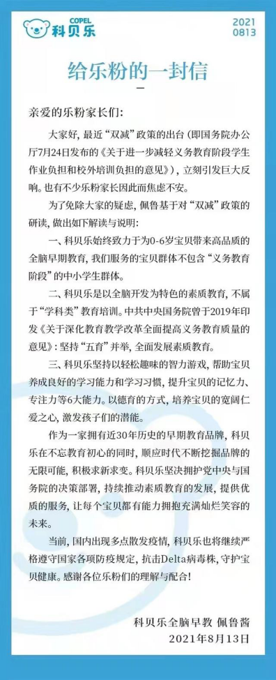 科貝樂在《給樂粉的一封信》表示:“科貝樂服務的寶貝羣體不包含‘義務教育階段’的中小學生羣體。科貝樂是以全腦開發為特色的素質教育,不屬於‘學科類’教育培訓。”