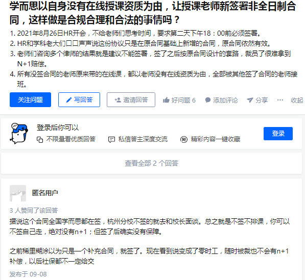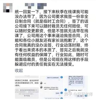有學而思老師表示,這樣的非全日制合同相當於**“臨時工合同”**,簽了之後,公司接下來可以隨時裁員無需任何賠償,也可以隨時變更薪資,但是不籤合同就無法繼續帶在線課程,“公司用這樣的方式躲避應付的責任,實在無法接受”。