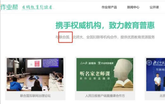 作業幫於2020年4月28日起,在其官方網站宣傳“攜手權威機構,致力普惠教育,與聯合國、北師大、全國婦聯等機構合作”等內容。