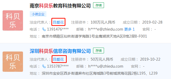 在8月29日,北京西紅門科貝樂托育有限公司的法人變更為呂愛花。而在此之前。從8月19日到8月底,與志學教育科技(上海)有限公司相關的位於北京、深圳、南京的10家子公司法人都變更為了呂愛花。