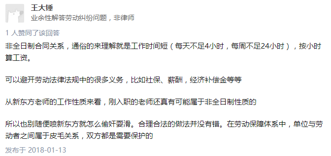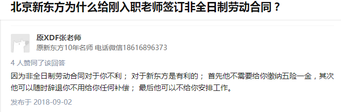 只是當時教培行業如日中天,也沒有多少人把這種合同當成大事看待,甚至還有站出來給機構説話的。可是也許出乎他意料的是,很多員工跟機構籤的是“工作時間短”的非全日制合同,乾的活卻跟“全日制”沒什麼區別,而且看不到轉正式合同的希望。