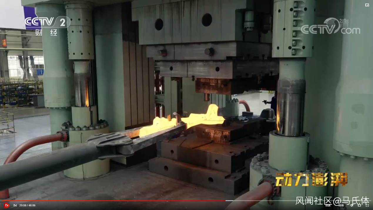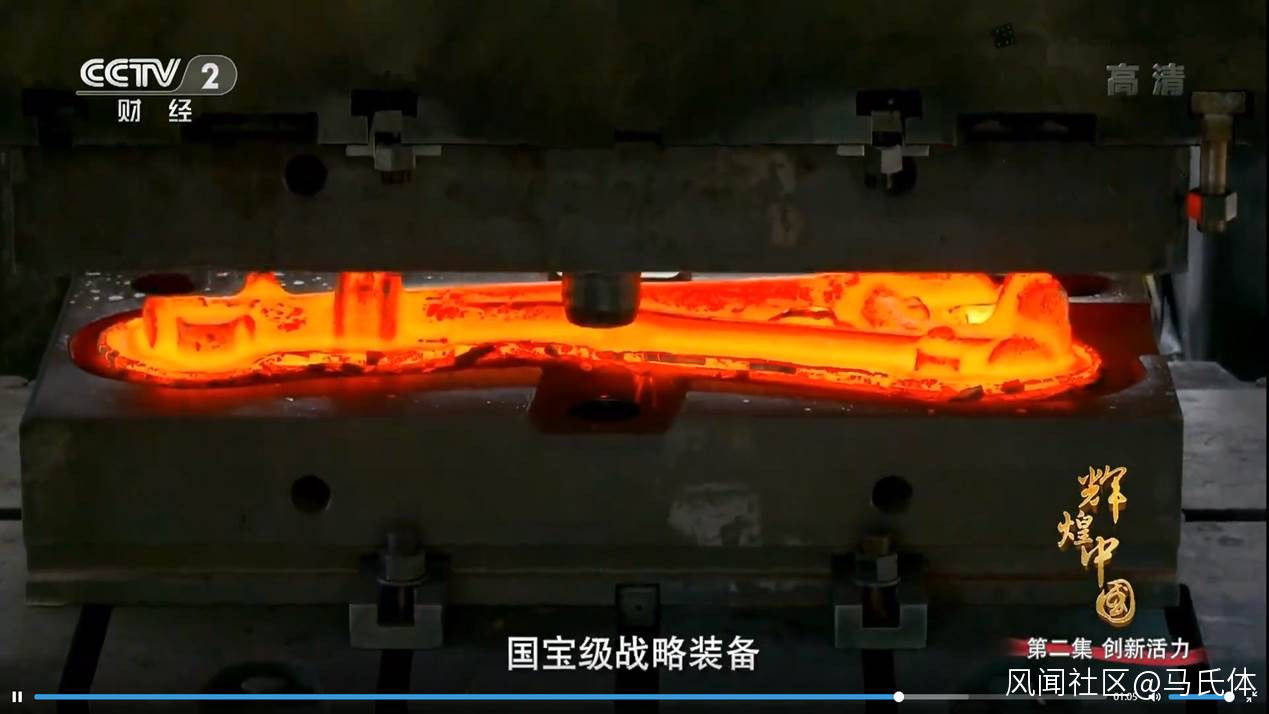 據統計,由鋁合金、鈦合金、高温合金、高強度鋼等材料鍛造而成的航空模鍛件,約佔飛機機體結構重量的20%~35%、佔發動機結構重量的30%~45%。使用整體模鍛件,可以提高構件的強度和剛度,減輕結構重量;減少裝配誤差,提高生產效率,也省去了連接件的重量;與用大塊材料切削得到零部件相比,模鍛件的材料利用率更高,因而節約了成本。隨着機體結構變得更加輕盈強健、發動機推力和效率與日俱增,對大尺寸模鍛件的需求也水漲船高,呼喚着我們自己的大型模鍛液壓機。(上圖為殲20的鈦合金整體式承力隔框,由西安三角防務的4萬噸模鍛壓機鍛造而成)