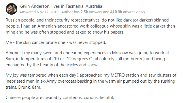 俄羅斯人民和他們的安全機構不喜歡皮膚黝黑的人。我有一個亞美尼亞的同事,他的膚色比我的還要深一些,他經常被攔住,要求他出示證件。