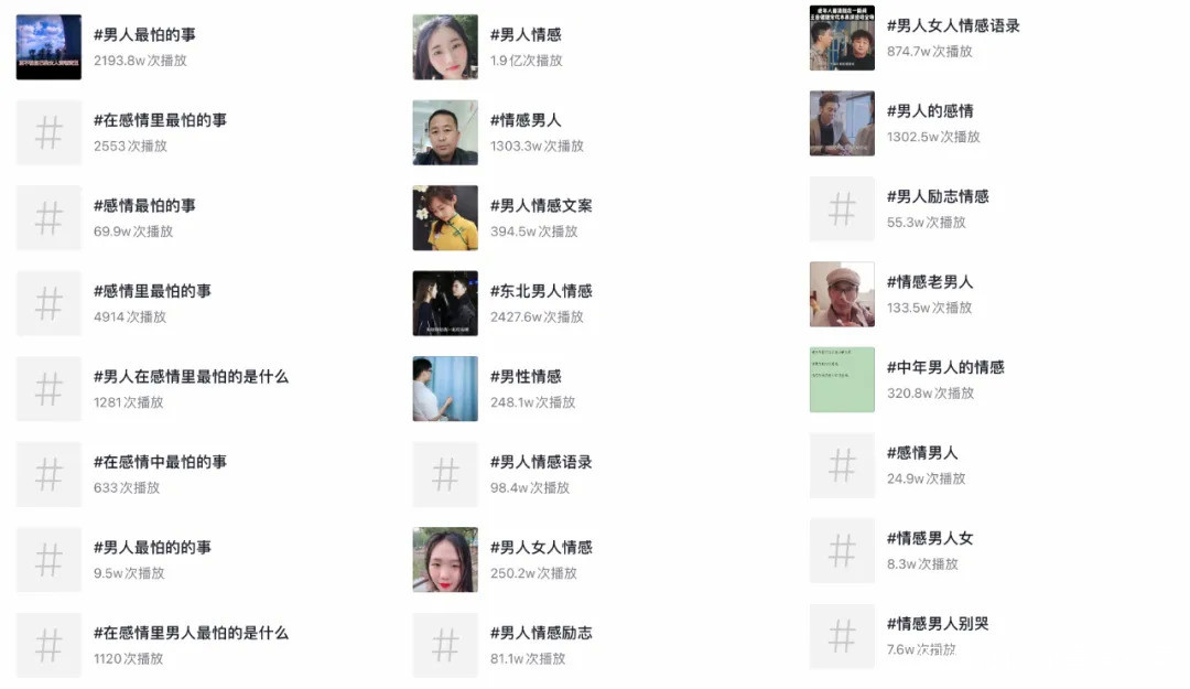 無數的情感博主蜂擁而至,#男人在感情裏最怕的事##男人成熟與不成熟的愛情觀##為什麼男人在感情裏如此卑微#等話題內容創造着不俗的流量。