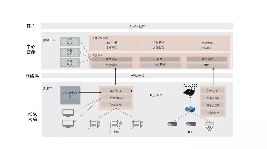 最底層是站級大腦,將基於昇騰AI處理器的Atlas 500智能小站和加油站的管控系統進行框架級集成;中間層是中心智能,以數據中心的形式打通了會員系統、發票系統、零管系統等,並定製研發了用户管理、車輛管理、加油管理等服務;最上層是用户體驗層,通過APP和小程序進行車輛註冊、發票申請、免密支付等功能。
