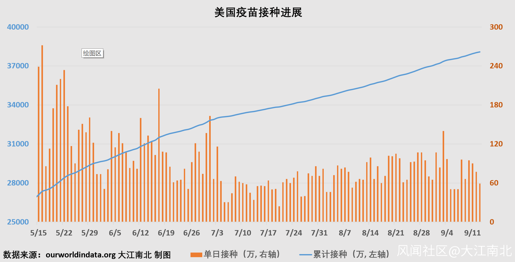 截止2021年9月13日,美國累計接種3.8083億劑,居全球第三位,其中單日新增接種59萬劑,創8月3日以來新低。美國至少接種一劑的人羣佔比為62.4%;完成接種的人羣佔比為53.2%。美國每百人累計接種113.23劑,比中國低39.24**,是中國的74.3%****。**