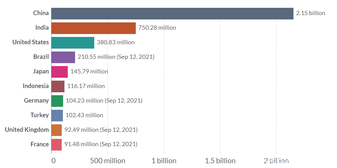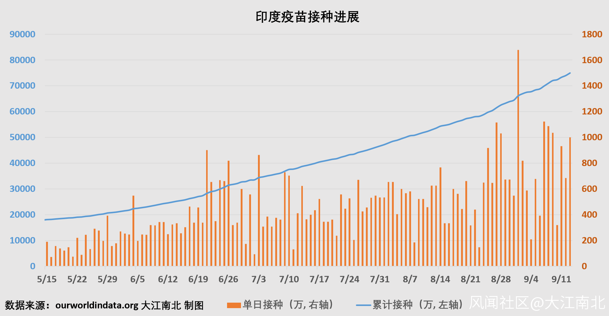 截止2021年9月13日,印度累計接種7.5028****億劑,列第二位,**其中單日新增接種1000萬劑。**印度至少接種一劑的人羣佔比為40.9%,完成接種的人羣佔比為12.9%。印度每百人累計接種53.85劑,是中國的35.3%。