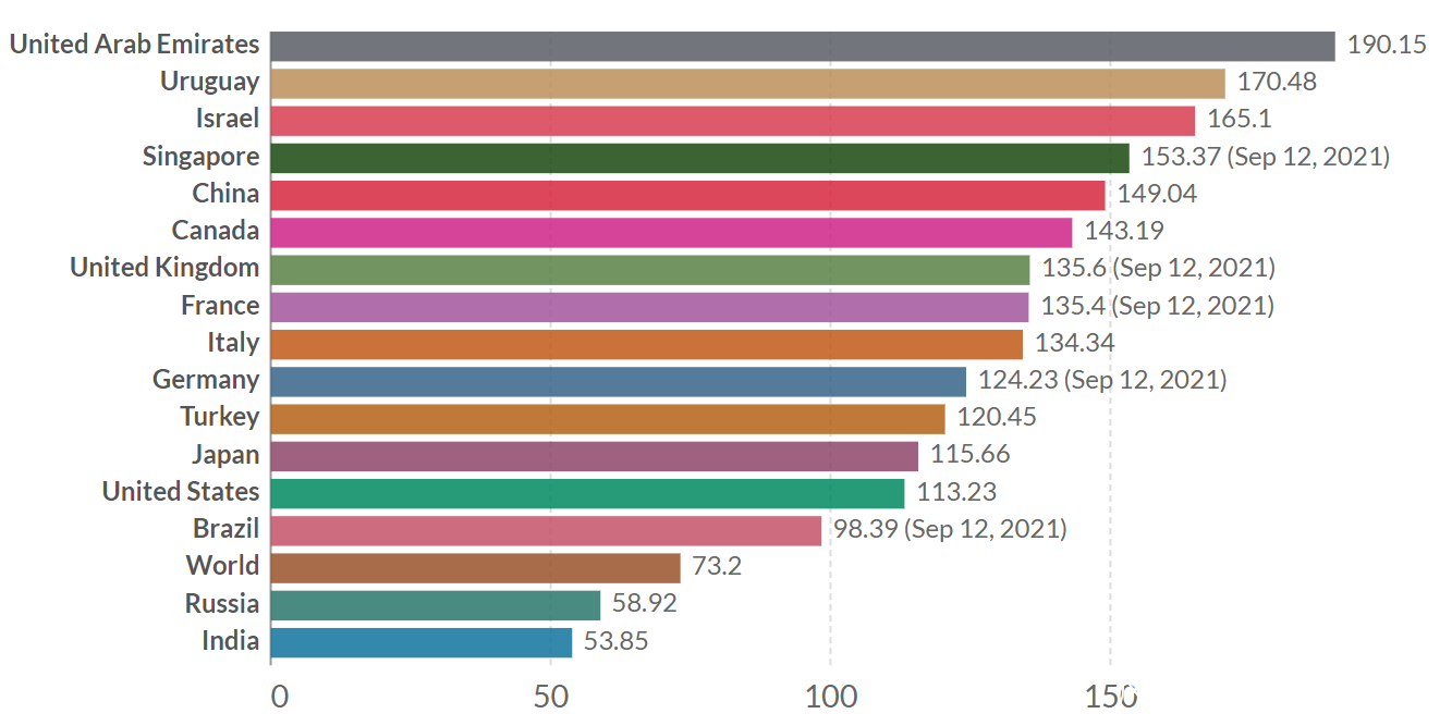 截止2021年9月13日,全球平均每百人接種73.20劑,環比增加0.31劑。