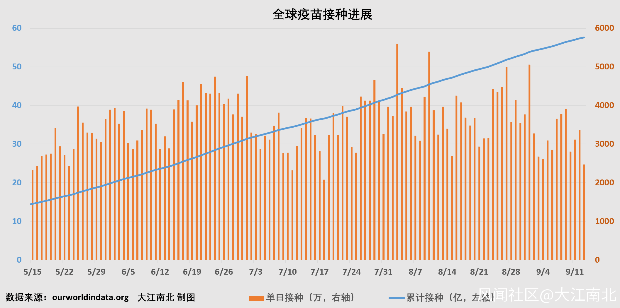 截止2021年9月13日,全球累計接種新冠疫苗57.65億劑;**其中單日接種2475萬劑;**平均每百人接種73.20劑,環比增加0.31劑。