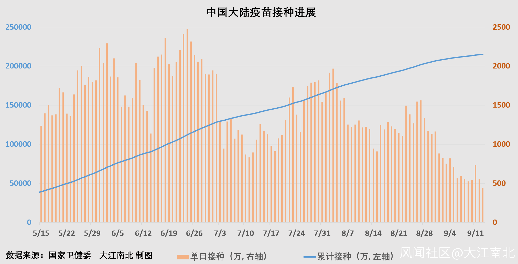 截止2021年9月13日,中國大陸累計接種新冠疫苗21.5252億劑,繼續位居全球第一位,佔全球累計接種劑數的37.3%;其中單日新增接種440萬劑,創4月25日以來新低,佔全球單日接種劑數的17.8%。中國每百人累計接種152.47劑,環比增加0.31劑,是美國的1.35倍,位居世界主要大國之首。