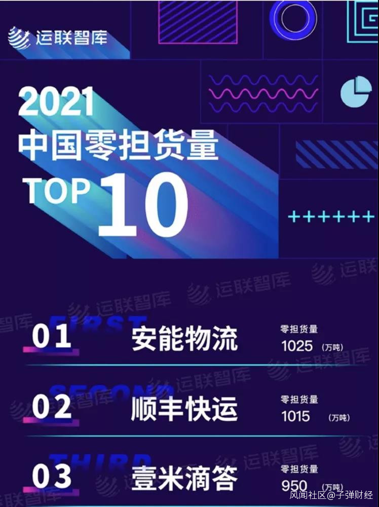 根據運聯研究院發佈的《2021中國快運行業白皮書》顯示,安能物流以總貨量1025萬噸的規模排名第一,成為“快運之王”,甚至超過了有直營和加盟兩張網絡的順豐快運。