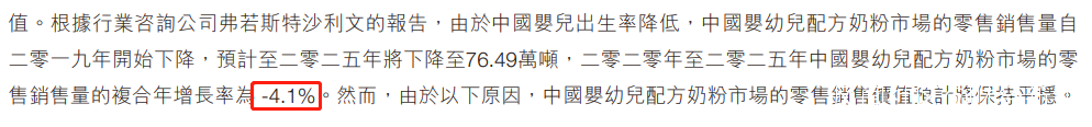 隨着人口出生率持續下降,嬰幼兒市場逐步縮小已成定局,弗若斯特沙利文報告表示,國內嬰幼兒配方奶粉市場預計2020年至2025年市場的零售銷售量的複合年增長率為-4.1%,飛鶴等國產奶粉目前的增長很大一部分都是從進口奶粉品牌手中搶回的市場。